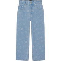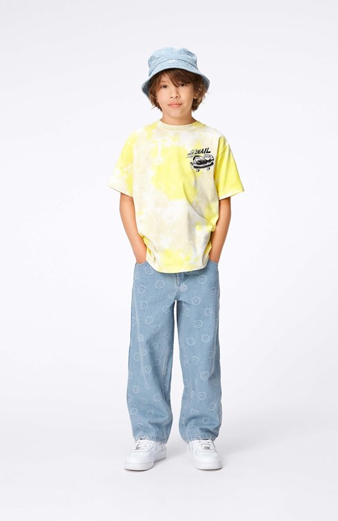 5-pocket Jeans in a washed cotton denim with small smiling faces woven into the fabric The jeans are in a loose fit, have straight legs and have a zip and button fly. They have adjustable elastic at the waist so they fit most children perfectly. Please note that sizes up to and including 134 have snaps and not regular buttons