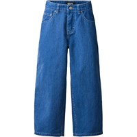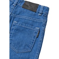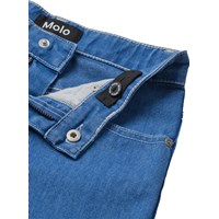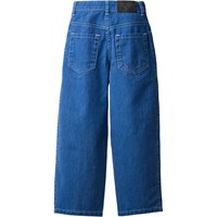 Blue jeans madeof cotton denim. The jeans have 5 pockets, straight legs, a zip fly, and a loose fit with adjustable elastic in the waist. The smallest sizes (92–134) have a press stud, while sizes 140–176 have a classic jeans button.