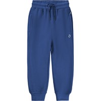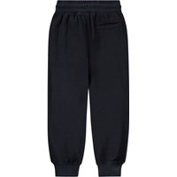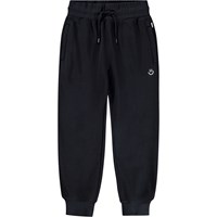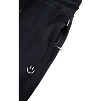 Black sweatpants made of organic cotton with an elastic waist, inner drawstring, zip pockets and ribbed cuffs at the ankles. The sweatpants have a regular fit and a small embroidered face by the pocket. The brushed interior makes them soft and warm to wear.