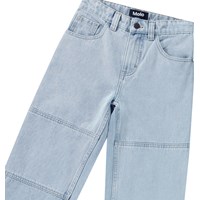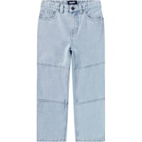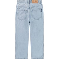 Light blue oversized jeans with 5 pockets and belt loops, featuring stitching at the knees. The jeans have an oversized fit.The waistband can be adjusted with an internal elastic, ensuring a perfect fit for all children. Sizes 92-134 have a snap button for easy on and off, while sizes 140-176 have a regular jeans button.If you prefer a more standard fit, we recommend choosing a size smaller than usual. This also applies if the child is between two sizes.