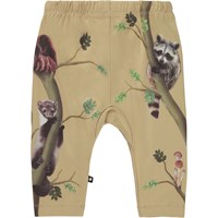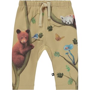 Beige trousers with a placement print for small children. The print shows a lot of different animals up in a tree with leaves and mushrooms growing on it. These trousers are in 100% cotton and have ties at the waist. Wear them with the Eloy top in the "Together" print.