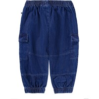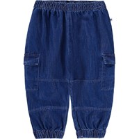 Blue pants for the little ones made of soft organic cotton denim. The pants have a loose fit and cargo pockets on the thighs. They also have an elastic waist that makes them easy to put on and take off and elastic cuffs at the ankles.