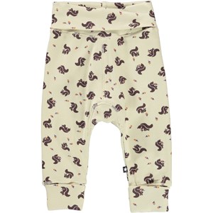 San is a pair of soft, light yellow baby trousers with a print of squirrels and nuts. They have wide elastic at the waist and legs. The waist and legs can also be rolled up or down. Wear them with a matching top.
