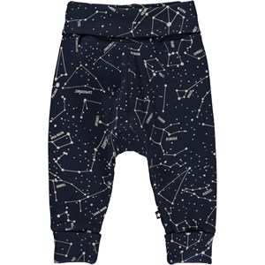 San is a pair of soft, dark blue baby trousers in a print of a star map. They have wide elastic at the waist and legs. The waist and legs can also be rolled up or down. Wear them with a matching top.