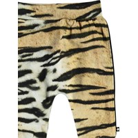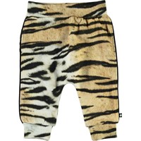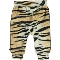 Shona is a pair of baby sweatpants in a tiger print. They have elastic at the waist and legs.