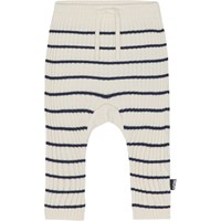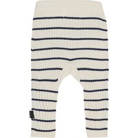 White rib knit trousers in dark blue stripes for small children. These trousers are in a cotton/wool blend. They have long legs with a drawstring waist. Wear them with the Bendix jumper in the same quality for the perfect set.