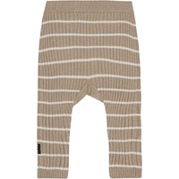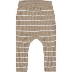 Beige rib knit trousers in white stripes for small children. These trousers are in a cotton/wool blend. They have long legs with a drawstring waist. Wear them with the Bendix jumper in the same quality for the perfect set.
