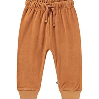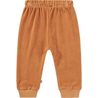 Orange joggers for the little ones, made from organic cotton velour with an unbrushed inner face that keeps them nice and cool on hot days. The trousers have both an elastic waistband and a drawstring, as well as rib cuffs at the legs, making them easy to take off and put on while also providing plenty of room for movement.