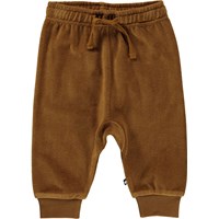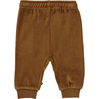 Sigo is a pair of light brown velour baby trousers in a loose fit. They have elastic at the legs and waist, which also has ties.