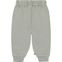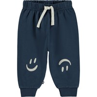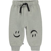 Grey melange trousers with a placement print for small children. The print is of small smiley faces that are ready for trouble! These trousers are in 100% cotton, and they have elastic and black ties at the waist and rib at the legs. Wear them with the Disc jumper in the same print for the perfect set.
