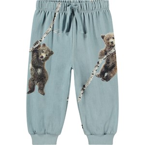 Light blue joggers for the little ones in organic cotton with an unbrushed inner face, making them pleasantly cool on hot days. The trousers have an elastic waistband and drawstring, as well as ribbed cuffs at the legs. They are easy to put on and take off, providing plenty of freedom of movement. On the sides, there is a print of two bear cubs climbing birch trees.