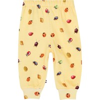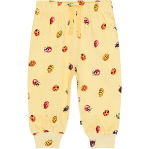 Yellow sweatpants in organic cotton. They have elastic with a drawstring at the waist and rib at the legs. They are comfortable and easy to pull on and move around in. The sweatpants are in an all over print of sweet, colourful ladybugs and snails. You can wear the sweatpants with a matching jumper for a soft sweatsuit.