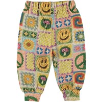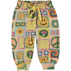 Multi-coloured trousers in an all over crochet print for small children. Molo has been crocheting on this print, creating its own interpretation of a popular trend. You can spot rainbows, smiley faces, mushrooms, sunflowers and peace signs. Pull out your own crochet hooks and start crocheting in your own colours and patterns. Let your imagination run wild! These trousers are in 100% cotton and have elastic with ties at the waist as well as rib at the legs. Wear the trousers with the Disc jumper in the same print for the perfect set.