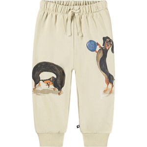 Soft pants for the little ones made of organic cotton. The pants are beige with a print of dachshunds. The pants have elastic and a tie at the waist and ribbed cuffs at the ankles. They are easy to put on and take off and have plenty of space to move. Combine it with the matching sweatshirt for a complete outfit.