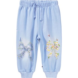 Soft, blue sweatpants for the little ones made of organic cotton with a floral print. The sweatpants have elastic and drawstring at the waist, ribbed edges at the ankles, and an unbrushed inside.