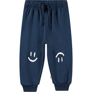 Navy joggers for the little ones made of organic cotton with a brushed inner face, making them soft and warm to wear. The trousers have elastic and drawstrings at the waist, as well as rib cuffs at the legs. They are easy to put on and take off, have plenty of room for movement, and have small smiley faces printed in white on the knees.