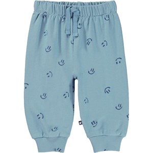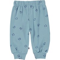 Blue trousers in an all over print of small, sweet smiley faces in dark blue. These trousers are in 100% cotton and have elastic with ties at the waist as well as rib at the legs. Wear the trousers with the Disc jumper in the same print for the perfect set.