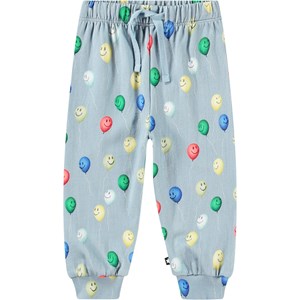 Light blue joggers for the little ones in organic cotton with an unbrushed inner face, making them pleasantly cool on hot days. The trousers have an elastic waistband and drawstring, as well as ribbed cuffs at the legs. They are easy to put on and take off, providing plenty of freedom of movement. The trousers feature a multicoloured all-over print with cheerful balloons in various colours.