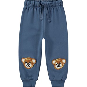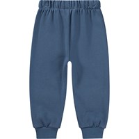 Blue joggers for the little ones made from organic cotton with a brushed inner face, making them soft and warm to wear. The trousers have an elastic waistband and drawstrings, as well as rib cuffs at the legs. They are easy to put on and take off, provide plenty of room for movement, and feature teddy bear patches on the knees.