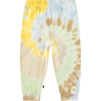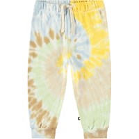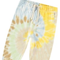 Multicoloured tie-dye pants in organic cotton for the little ones. The pants have an elasticated waist with a drawstring and ribbed cuffs at the ankles. They are easy to put on and take off and have plenty of room for movement. This style has an unbrushed inside, making them pleasantly cool on a hot day. Pair with a matching sweatshirt for a complete outfit.All our tie-dye is handmade, creating unique patterns that vary from style to style.