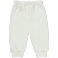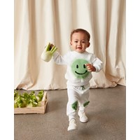 Simeon is a pair of white baby sweatpants with a print of green smiley faces on the legs. They have an elastic waist with ties.