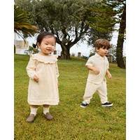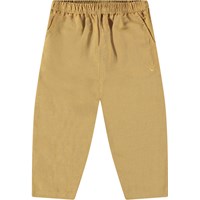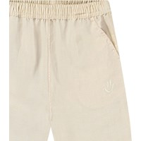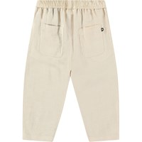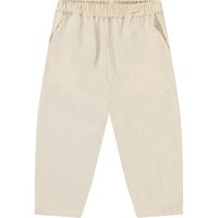 Pants in organic cotton for the little ones. The pants have a loose fit, front and back pockets, and an elastic waist, making them easy to put on and take off. Lightweight and airy. The pants are light beige with a small embroidered smiling face by the pocket. Pair with a matching shirt for a complete look.