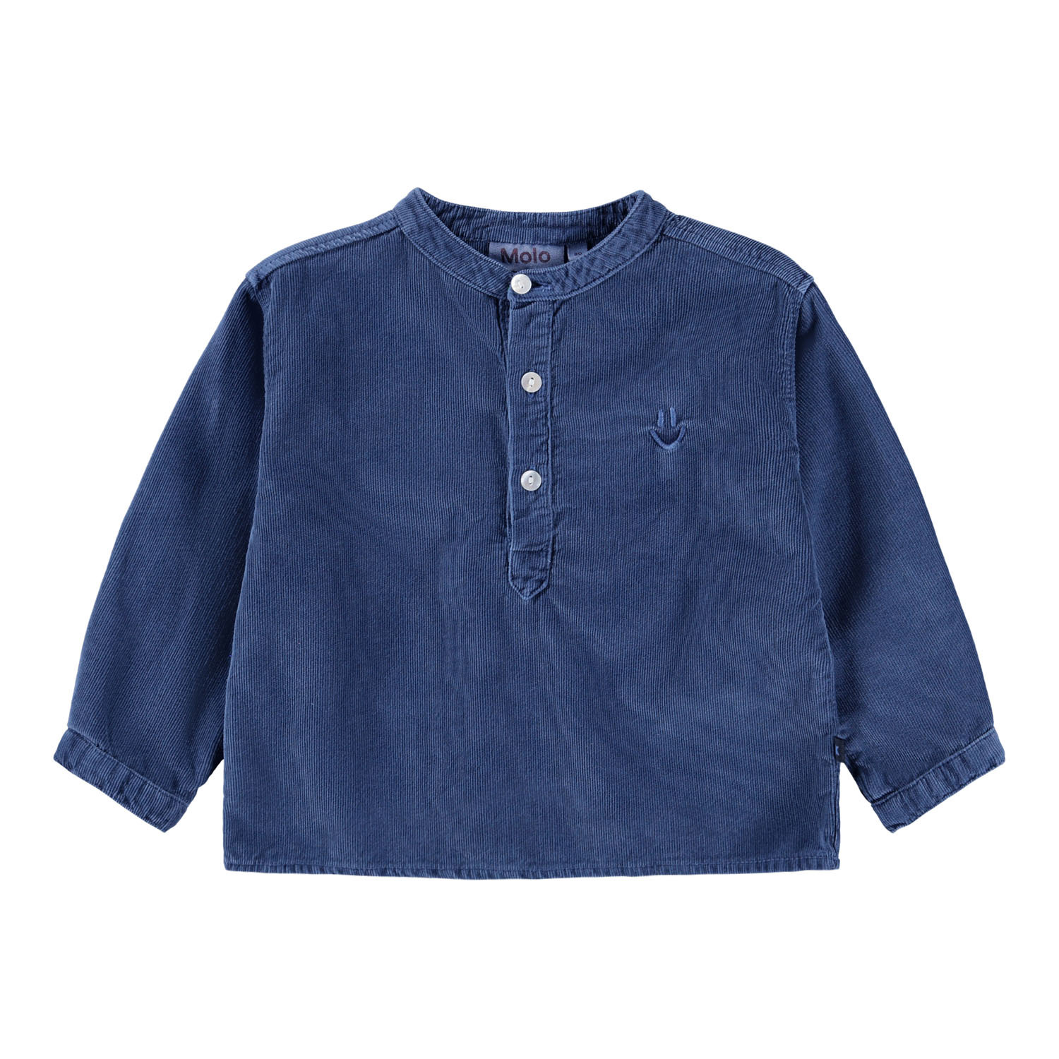 Dark blue velvet shirt for the little ones made of organic cotton. The shirt has a mandarin collar and a button placket with three white buttons. The loose fit makes it comfortable to wear and easy to put on and take off. On the chest, there is a little pink smiling face embroidered. Combine it with the matching pants or shorts for a complete outfit.