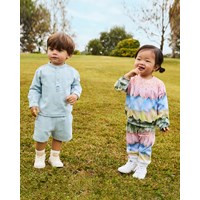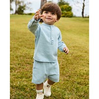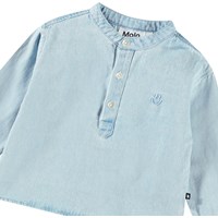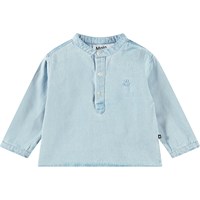 Light blue denim shirt for the little ones in organic cotton. The shirt features a mandarin collar and button placket with three white buttons. The loose fit makes it comfortable to wear and easy to put on and take off. On the chest, there is a small smiling face embroidered in light blue. Pair with the matching trousers or shorts for a complete outfit.