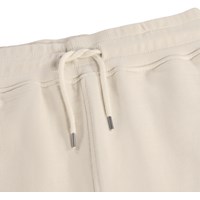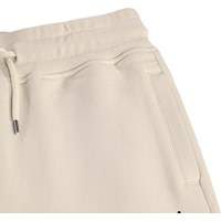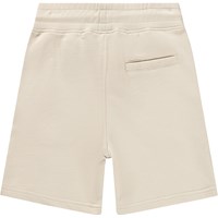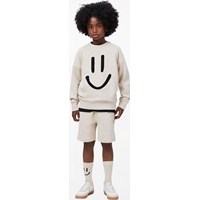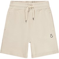 Beige shorts made of soft organic cotton jersey. They have a simple and relaxed look with side pockets, a back pocket, and a small embroidered smiley face on the front. The waist is elastic and can be adjusted with a drawstring for an optimal fit.