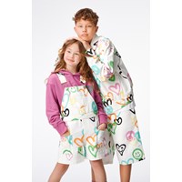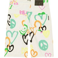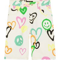 White denim shorts with a multi-coloured, all over heart print. The shorts are knee length, have front and back pockets, a leather logo patch and an adjustable inner elastic at the waist with a button and zip fly.