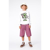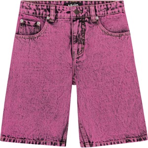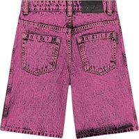 Purple, knee length, denim shorts in washed cotton. They have front and back pockets, a snap and zip fly and belt loops. Sizes 92-134 have an inner button to adjust the waist for the perfect fit, and it helps a child wear the shorts longer. They are in a cool, washed look in purple and black.