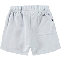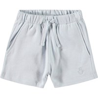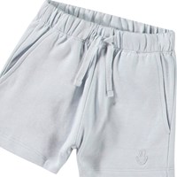Soft shorts in organic cotton for the little ones. Elastic waist with drawstring, two pockets, and room to move. These shorts are light blue with an embroidered smiling face on one leg.