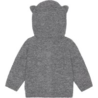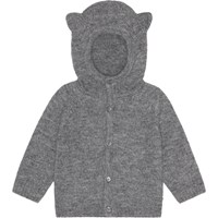 Grey melange knit cardigan with a hood. This cardigan is in a soft alpaca wool blend, has long sleeves, a button front closure and sweet bear ears on the hood. It has a knit rib at the sleeves and bottom, and the hood closes tightly around the face to keep out the cold.