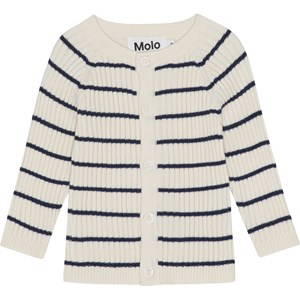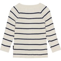 White cardigan for small children in a rib knit with dark blue stripes. This cardigan is in a cotton/wool blend, has a round neck with knit rib, long raglan sleeves, a button front closure and knit rib at the sleeves and bottom. Wear this cardigan with the Sigmund trousers in the same quality for the perfect set.