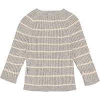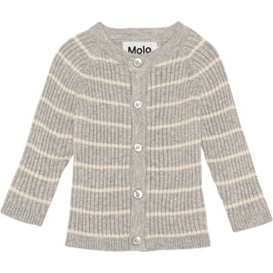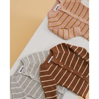 Bendix is a grey knit cardigan in rib with narrow white horizontal stripes. The cardigan has a round neck. Wear it with matching knit trousers.