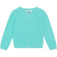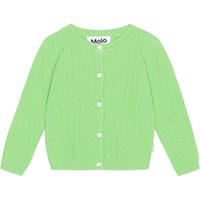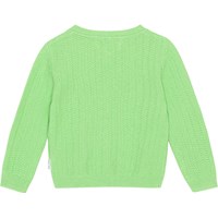 Green knit cardigan for small children in soft, organic cotton. The cardigan has a round neck and rib at the sleeves, neck and bottom. It has a small, white buttons on the front. The cardigan has a lovely knit pattern that gives it an exclusive, luxurious look.