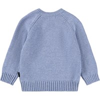 Light blue knitted sweater for the little ones made of a soft cotton and wool blend with a brown teddy bear on the front. The sweater has a round neck, ribbed edges and buttons at the neck to make it easy to put on and take off. Combine it with the matching pants for a complete set.