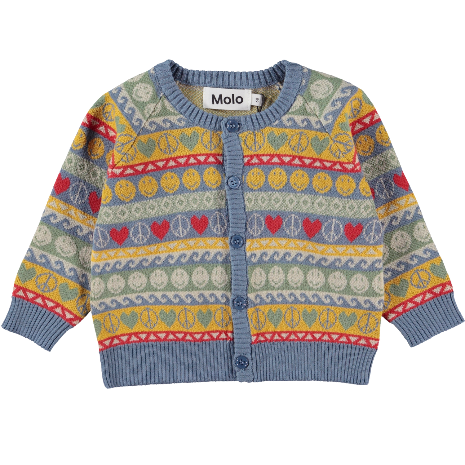 Brody is a baby knit cardigan in cotton with mulit-coloured stripes, where hearts, peace signs and smiley faces are part of the design. The cardigan has a button front closure. Pair it with the matching baby trousers.