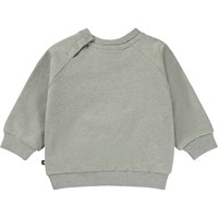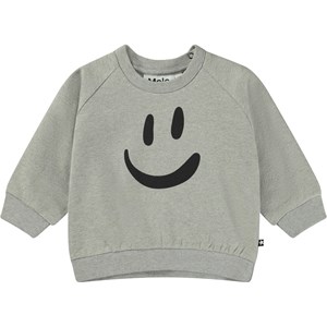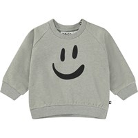Grey melange sweatshirt for small children with a placement print on the front stomach of a large smiley face that's ready for trouble. This sweatshirt is in 100% cotton and has a round neck with a rib edge, raglan sleeves, a rib edge at the sleeves and bottom and an easy snap closure at the neck. Wear the sweatshirt with the Simeon joggers in the same print for the perfect set.