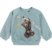 Light blue sweatshirt for the little ones in organic cotton jersey with an unbrushed inner face, making it pleasantly cool on hot days. The sweatshirt has raglan sleeves, rib cuffs at the waist and sleeves, and a round neckline with two poppers at the back, making it easy to put on and take off. On the front of the sweatshirt is a cute print of a bear cub climbing a birch tree.
