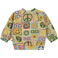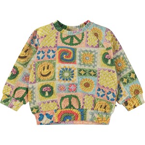 Multi-coloured sweatshirt for small children in an all over print. Molo has been crocheting on this print, creating its own interpretation of a popular trend. You can spot rainbows, smiley faces, mushrooms, sunflowers and peace signs. Pull out your own crochet hooks and start crocheting in your own colours and patterns. Let your imagination run wild! This sweatshirt is in 100% cotton, and it has a round neck with a rib edge and rib at the sleeves and bottom. It has an easy snap closure at the neck. Wear the sweatshirt with the Simeon joggers in the "Animal Living" print for the perfect look.