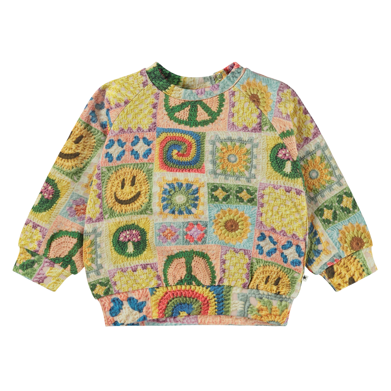 Multi-coloured sweatshirt for small children in an all over print. Molo has been crocheting on this print, creating its own interpretation of a popular trend. You can spot rainbows, smiley faces, mushrooms, sunflowers and peace signs. Pull out your own crochet hooks and start crocheting in your own colours and patterns. Let your imagination run wild! This sweatshirt is in 100% cotton, and it has a round neck with a rib edge and rib at the sleeves and bottom. It has an easy snap closure at the neck. Wear the sweatshirt with the Simeon joggers in the "Animal Living" print for the perfect look.