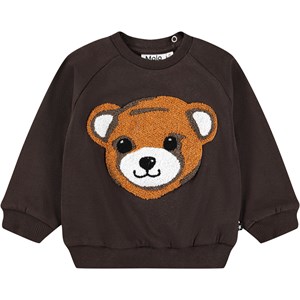Dark brown sweatshirt for the little ones made of soft organic cotton with an embroidered teddy bear face on the front. The sweatshirt has raglan sleeves, ribbed edges around the waist and sleeves and a round neckline with two snap buttons at the neck to make it easy to put on and take off. Combine it with the matching pants for a complete set.