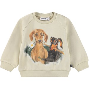 Beige sweatshirt for the little ones made of soft organic cotton with a dog print on the front. The sweatshirt has raglan sleeves, ribbed edges around the waist and sleeves and a round neckline with two snap buttons at the neck to make it easy to put on and take off. Combine it with the matching pants for a complete set.
