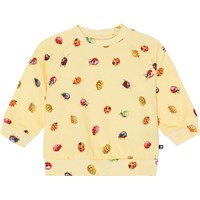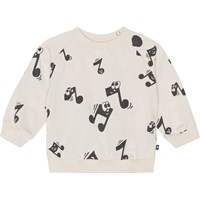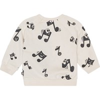 Off-white jumper for small children in organic cotton jersey. The jumper has rib at the sleeves, neck and bottom. The neck has an easy, two-snap closure. The jumper has a black, all over print of happy, hopping notes. You can wear this style with the matching trousers for a complete, soft jersey set.