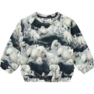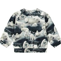 Blue and white sweatshirt for the little ones in organic cotton jersey with an unbrushed inner face, making it pleasantly cool on hot days. The sweatshirt has raglan sleeves, rib cuffs at the waist and sleeves, and a round neckline with two poppers at the back, making it easy to put on and take off. The sweatshirt features an all-over print of a bunch of polar bears frolicking in the snow.