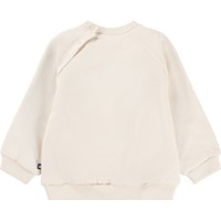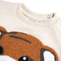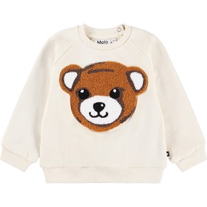 Off-white sweatshirt for the little ones made of soft organic cotton with an embroidered teddy bear face on the front. The sweatshirt has raglan sleeves, ribbed edges around the waist and sleeves and a round neckline with two snap buttons at the neck to make it easy to put on and take off. Combine it with the matching pants for a complete set.