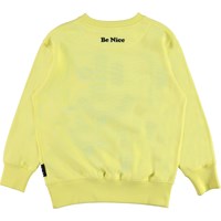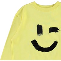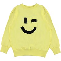 Mattis is a unisex sweatshirt in light yellow with a print of a smiley face on the front. The top has a round neck. Wear the sweatshirt with the matching trousers.