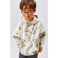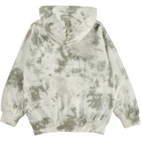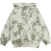 Maxx is a unisex hoodie with a tie-dye pattern in beige and green. The hoodie has a pouch pocket on the front and a rib edge at the bottom and sleeves. All of Molo's tie-dye is made by hand, so each product has its own unique look.