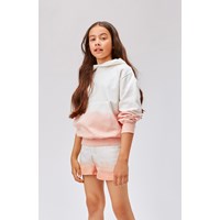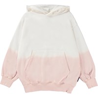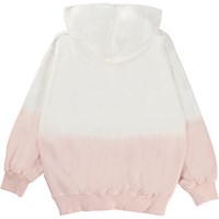 Maxx is a unisex hoodie that is white on top and pink at the bottom. The hoodie has a pouch pocket on the front and a rib edge at the bottom and sleeves.